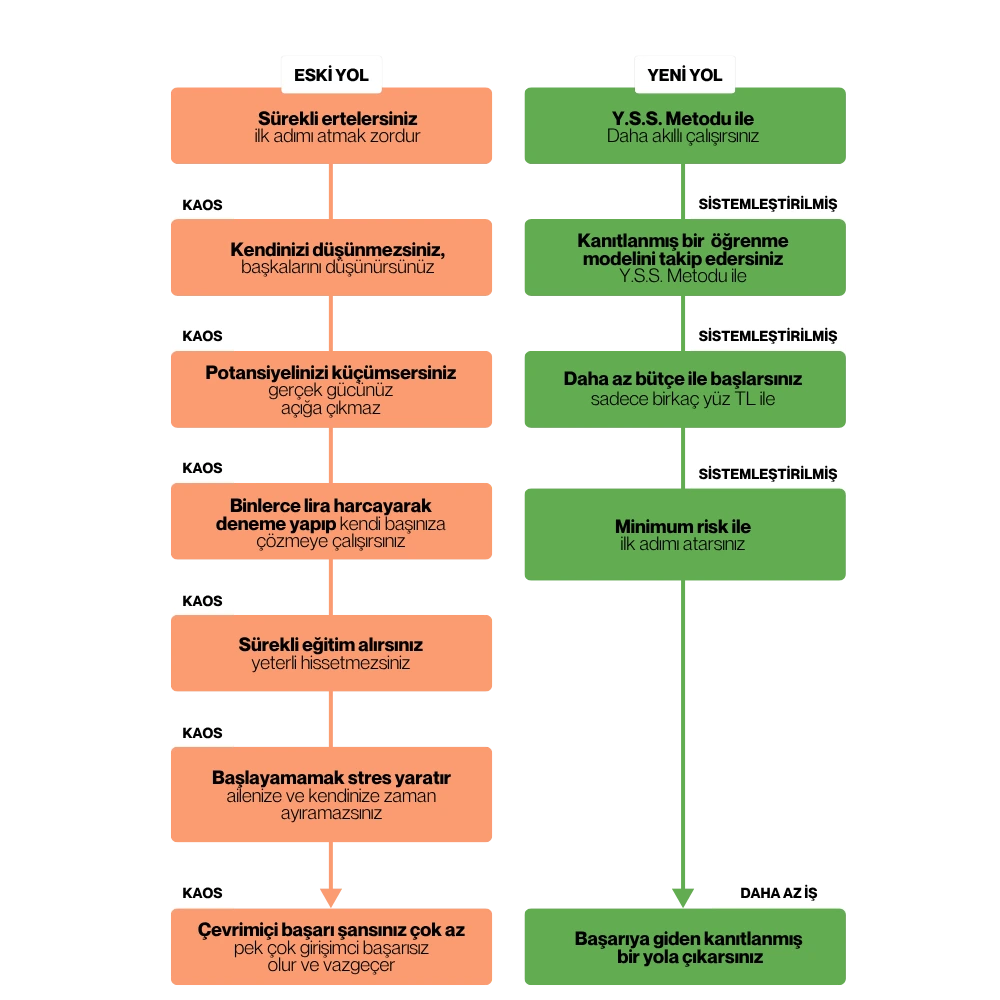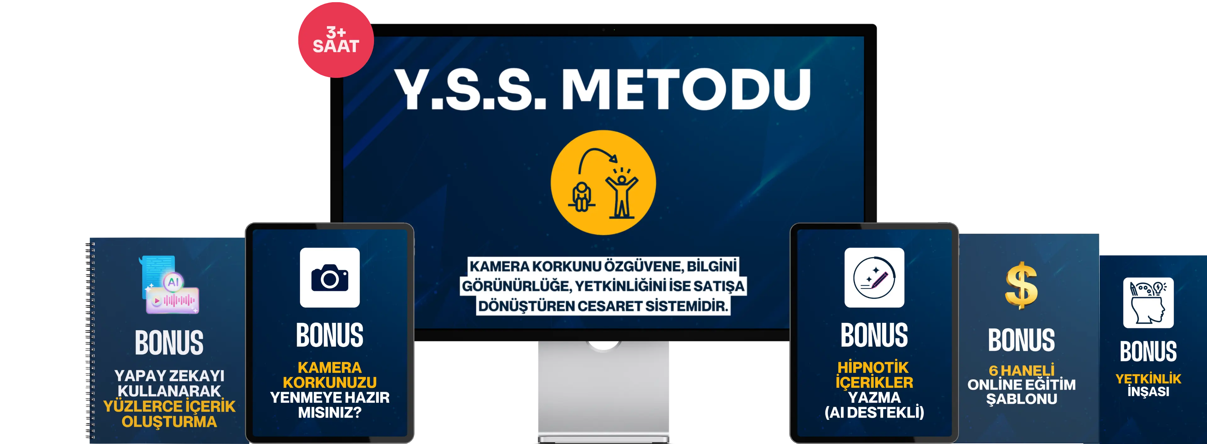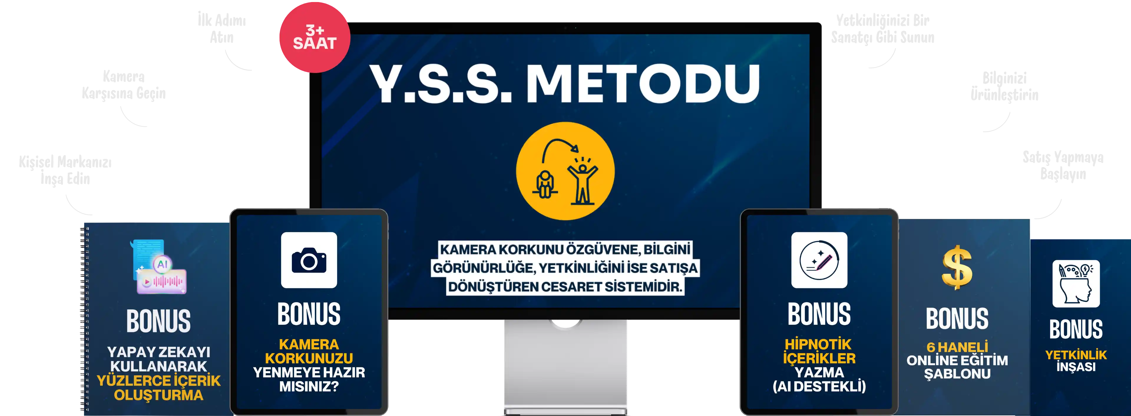 Y.S.S. Metodu, bilgini ve yetkinliğini bir sanatçı gibi sunmanı sağlayan, kamera korkunu kırarak seni dikkat çeken bir kişisel marka haline getiren, sonuç odaklı bir sistemdir.